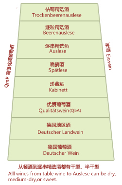 --逐串精選酒(Auslese):通常是甜型酒,特別精致的葡萄酒由完全成熟的葡萄釀制而成。